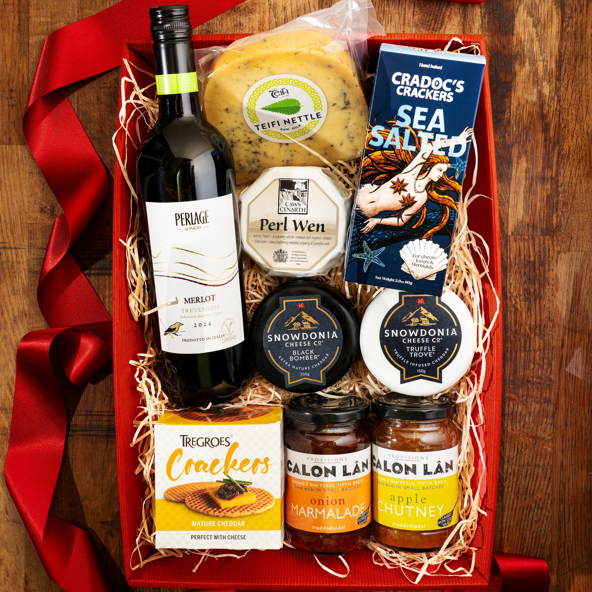 4 Welsh Cheeses, 2 boxes of Welsh Crackers, 2 Chutneys and a bottle of Red Wine all presented in a hamper ready to gift. Place your order here and we will contact you to arrange collection or local delivery